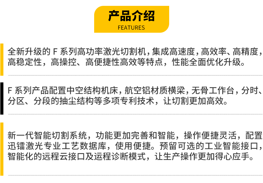 激光切割技術的逐漸普及,使其應用領域得到不斷拓展和加深。市場對超厚板穩定加工、無煙無塵、高效切割以及服務質量提出了更高的要求。迅鐳激光繼往開來、永續創新,始終位于“高功率與智能化”激光切割技術領域制高點。第8代激光切割裝備擁有10大核心優勢,助力客戶降本增效,樹行業高端典范。